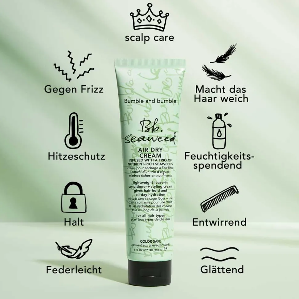 Das Bumble and bumble Bb. Seaweed Air Dry Leave-In ist eine meisterhaft entwickelte Rezeptur, die Ihr Haar auf eine völlig neue Ebene der Pflege hebt. Dieses einzigartige Produkt vereint die Kraft von drei nährstoffreichen Algen und bietet so eine außergewöhnliche Pflege, die sofort Feuchtigkeit spendet und das Haar geschmeidig macht. Besonders hervorzuheben ist die Fähigkeit, Frizz und Flyways effektiv zu reduzieren. Dank der lufttrocknenden Formel gewinnen Sie an Flexibilität im Styling, während gleichzeitig ein sanfter Glanz erhalten bleibt. Diese besondere Leave-In-Pflege unterstützt zudem eine gesunde Kopfhautumgebung, was für die langfristige Gesundheit Ihres Haares von großer Bedeutung ist. Einfach in die Kopfhaut und das feuchte Haar einmassieren, durchkämmen und wie gewünscht stylen. Die Formel ist farbsicher und für alle Haartypen geeignet, was sie zu einem unverzichtbaren Begleiter in Ihrer täglichen Haarpflegeroutine macht.