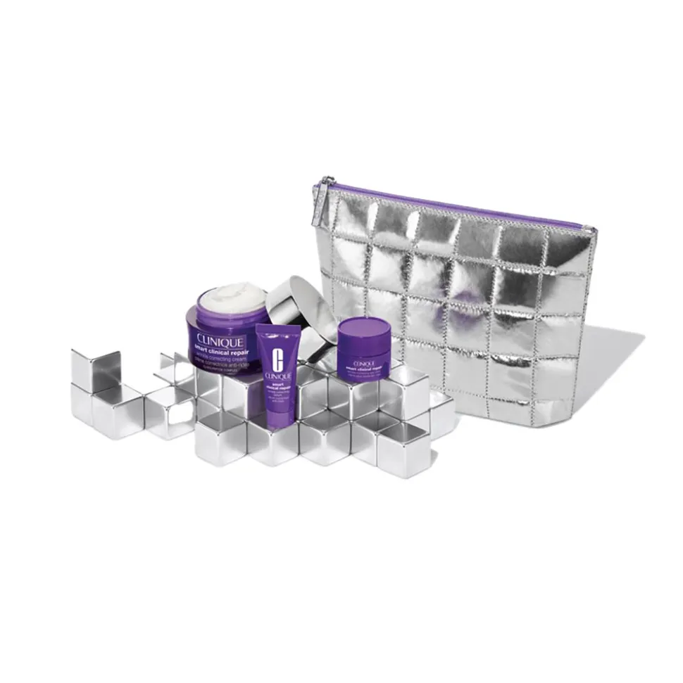 Mit Clinique Get Smart erhalten Sie eine umfassende Pflege, die speziell für alle Hauttypen, inklusive empfindlicher Haut, entwickelt wurde. Im Mittelpunkt steht das fortschrittliche De-Aging-Trio, das eine sichtbar jünger aussehende Haut fördert. Das Set beinhaltet das Clinique Smart Clinical Repair Wrinkle Correcting Serum, das hartnäckige Linien und Falten gezielt bekämpft. Dank seines sanften Retinoids ist es zweimal täglich anwendbar. Die Wrinkle Correcting Cream spendet intensive Feuchtigkeit und reduziert Falten sichtbar, sorgt so für ein glatteres, jugendliches Hautbild. Ergänzt wird das Set durch die Wrinkle Correcting Eye Cream, die die empfindliche Augenpartie stärkt und glättet. Alle Produkte wurden auf Allergien getestet und sind 100% parfümfrei, was sie zu einer sicheren Wahl für Ihre tägliche Hautpflege macht.