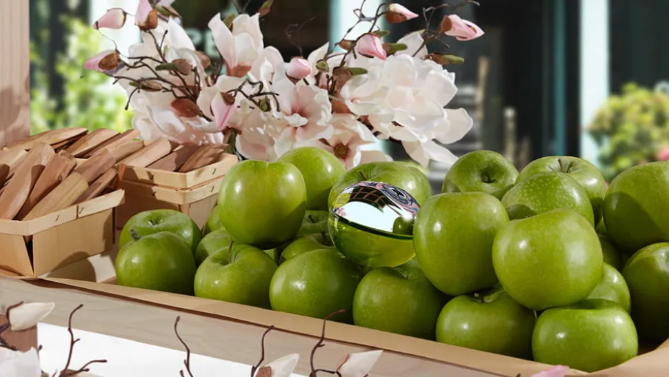 Der Flakon des DKNY Eau de Parfum Nat. Spray fasziniert mit seiner außergewöhnlichen Gestaltung. In Form eines glänzenden Apfels vereint er Eleganz und Modernität. Die obere Hälfte in metallischem Silber reflektiert das Licht auf eine subtile Weise, während der untere Teil in einem frischen Grün den Duft der floralen Apfelnote visuell widerspiegelt. Die sanften Rundungen des Flakons liegen angenehm in der Hand und machen ihn zu einem stilvollen Begleiter für jeden Anlass. Die präzise Verarbeitung und die harmonische Farbgebung unterstreichen die Qualität, die Sie von einem solch exquisiten Duft erwarten dürfen.