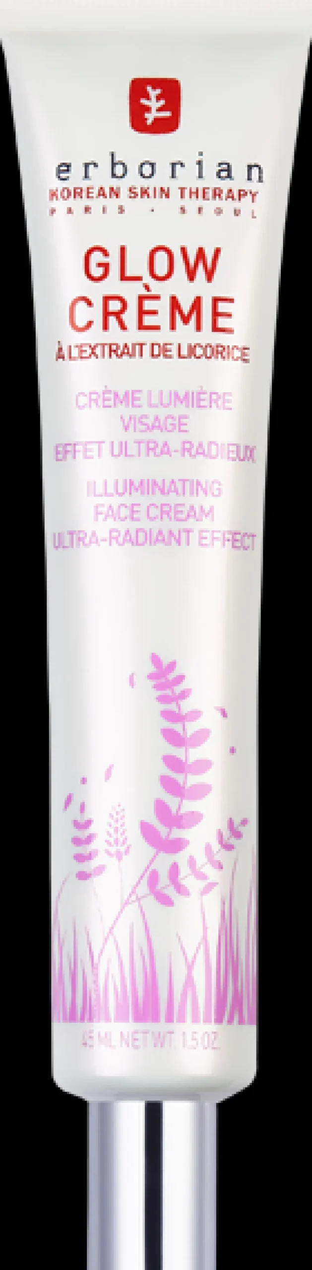 Die Erborian Glow Crème präsentiert sich in einem schlanken, eleganten Flakon, der durch seine klare Form besticht. Der weiße Hintergrund des Flakons wird kunstvoll von zarten lila Pflanzenmotiven durchbrochen, die an die Reinheit und Frische der Natur erinnern. Der dezente Glanz des Materials unterstreicht die luxuriöse Anmutung des Produkts. Auch die haptische Erfahrung überzeugt: Der Flakon liegt angenehm in der Hand und versprüht einen Hauch von Raffinesse und Stil. Diese optischen Details machen die Erborian Glow Crème nicht nur zu einem Pflegeschatz, sondern auch zu einem stilvollen Accessoire in Ihrer Pflegeroutine.