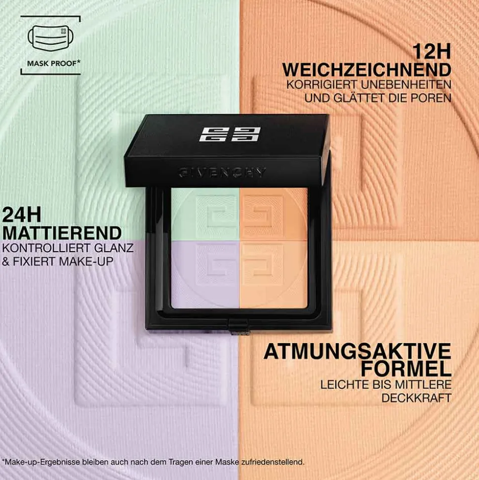 Entdecken Sie die herausragende Wirkung des Givenchy Prisme Libre Pressed Powder, das Ihnen einen makellosen Teint bietet. Dieser innovative 4-Farben-Kompaktpuder kaschiert Unebenheiten effektiv und sorgt für einen 12 Stunden lang perfekt-matten Teint. Durch seine besondere Formel wird überschüssiger Talg absorbiert und Glanz zuverlässig kontrolliert – für ein frisches Erscheinungsbild, das den ganzen Tag anhält. Angereichert mit Vitamin E und Seidenprotein-Extrakt schützt er Ihre Haut vor Austrocknung, während die leichte bis mittlere Deckkraft die natürliche Feuchtigkeit bewahrt. Selbst unter einer Maske bleibt Ihr Make-up makellos. Sein luxuriöses Design, komplettiert durch das silberne 4G Logo auf hochwertigem Kunstleder, macht ihn zu einem eleganten Begleiter.