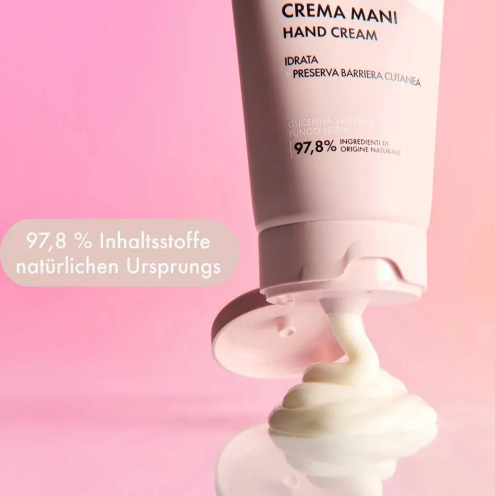 Die Save My Hands Handcreme bildet einen Schutzfilm, der die Hautbarriere vor Umwelteinflüssen bewahrt. Die Formel ist mit pflanzlichem Glyzerin, glänzendem Lackporling (Reishi-Pilz) mit seinen bekannten antioxidativen Eigenschaften und Mandelöl angereichert, um die Haut sofort und intensiv zu nähren. Die reichhaltige, sensorische und umhüllende Textur zieht leicht ein, ohne zu kleben, und sorgt den ganzen Tag lang für weiche, samtige Hände und ein angenehmes Gefühl. Klinisch-instrumentelle Tests ergaben*: +68,8 % Feuchtigkeitsgehalt nach 30 Minuten
