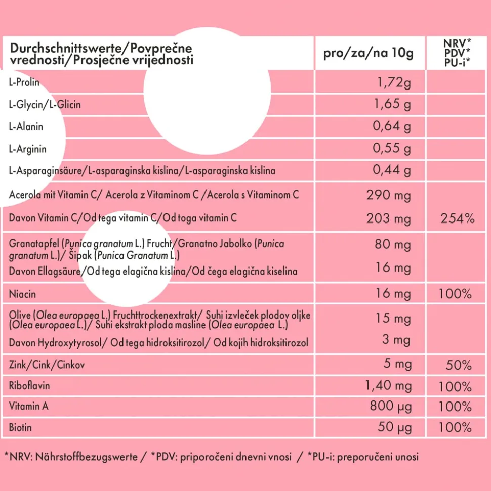 Nahrungsergänzungsmittel auf der Basis von Aminosäuren, Vitamin C, Granatapfel,Vitamin A, Niacin und Riboflavin. Vitamin C: trägt zu einer normalen Kollagenbildung für eine normale Funktion der Haut bei. Vitamin A, Niacin und Riboflavin: tragen zur Erhaltung normaler Haut bei.Nahrungsergänzungsmittel auf der Basis von Aminosäuren, Vitamin C, Granatapfel,Vitamin A, Niacin und Riboflavin. Vitamin C: trägt zu einer normalen Kollagenbildung für eine normale Funktion der Haut bei. Vitamin A, Niacin und Riboflavin: tragen zur Erhaltung normaler Haut bei.