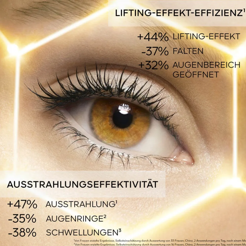 Das Guerlain Double R Eye Serum bietet eine luxuriöse Pflegeerfahrung, inspiriert von ästhetisch-dermatologischen Behandlungen. Mit seiner einzigartigen Renew-Formel schenkt es Ihrer Augenpartie eine revitalisierte Ausstrahlung. Die Kombination aus weißem Honig und einem erfrischenden Komplex wirkt tief in der Epidermis, um die Strahlkraft Ihrer Haut zu intensivieren und ihre Jugendlichkeit zu bewahren. Die Repair-Formel ergänzt diesen Effekt durch die Dynamic BlackBee Repair-Technologie. Diese nutzt die Wirksamkeit polyfermentierter Honigsorten für eine spürbare Straffung der Haut. Die außergewöhnlichen Bienenprodukte, handverlesen von den geschützten Inseln, fördern die natürlichen Reparaturmechanismen und mindern Zeichen vorzeitiger Hautalterung. So wirkt die Augenpartie glatter, Schwellungen und Farbabweichungen werden sichtbar reduziert, was zu einem frischen und offenen Blick führt.
