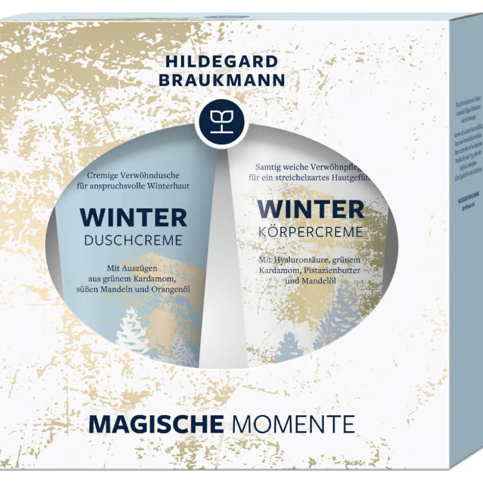 Das Hildegard Braukmann Magische Momente Winter Set bietet Ihnen eine luxuriöse Pflegeerfahrung, die speziell für die Bedürfnisse Ihrer Winterhaut entwickelt wurde. Die Winter Duschcreme reinigt sanft und hinterlässt einen himmlischen Duft von grünem Kardamom, süßen Mandeln und Orangenöl. Ihre Haut wird durch die rückfettenden und feuchtigkeitsspendenden Eigenschaften wunderbar gepflegt. Ergänzt wird das Set durch die Winter Körpercreme, die intensive Pflege und Glücksmomente für trockene Haut verspricht. Die reichhaltige Formel mit Hyaluronsäure, Mandelöl sowie Pistazien- und Kakaobutter stärkt die hauteigene Hydrolipidbarriere, sodass Ihre Haut streichelzart und geschmeidig bleibt.