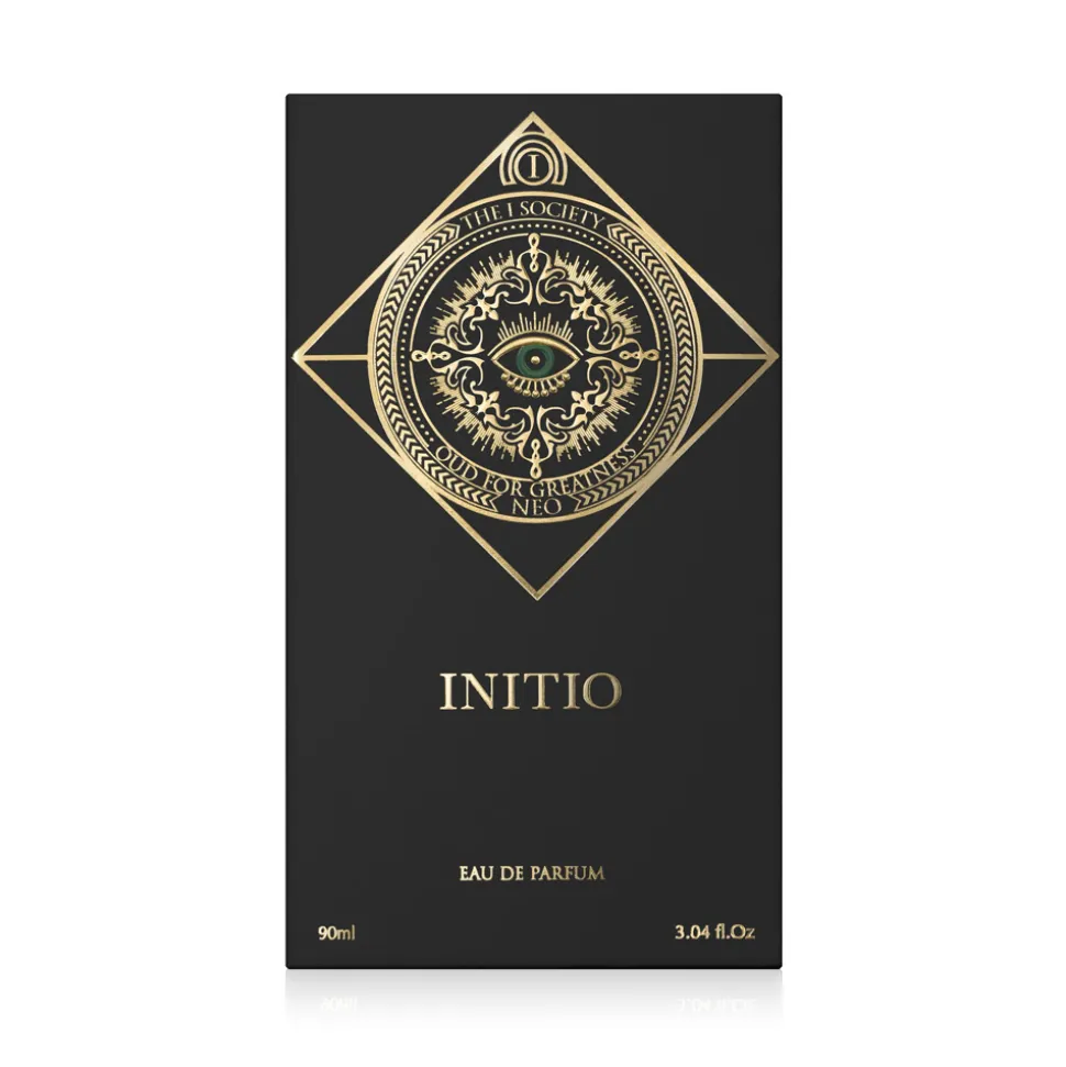 Der Flakon des Initio Parfums Privés Neo Eau de Parfum präsentiert sich in einem beeindruckenden Schwarz, das mit goldenen Akzenten veredelt ist. Die präzise geometrische Form des Flakons strahlt eine klare Eleganz aus, die durch das kunstvoll gestaltete Emblem auf der Vorderseite unterstrichen wird. Dieses Emblem, ein kunstvolles Auge umrahmt von feinen Linien, zieht den Blick an und verleiht dem Flakon eine mystische Note. Der Verschluss, mit seiner strukturierten Oberfläche, fügt sich harmonisch in das Gesamtbild ein und rundet das visuelle Erlebnis stilvoll ab. Dieses Design unterstreicht die luxuriöse Anmutung des Duftes und macht ihn zu einem optischen Highlight.