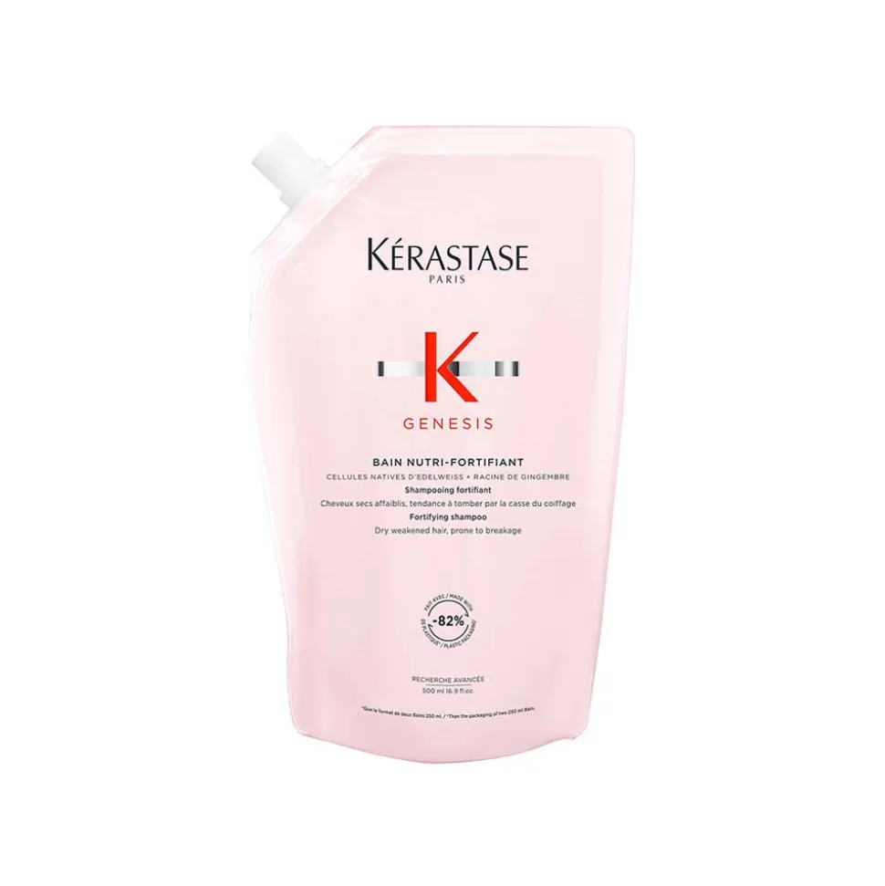 Bain Nutri-Fortifiant Genesis von Kérastase ist ein kräftigendes Shampoo gegen Haarverlust und Haarbruch ab der Haarwurzel. Es reinigt und kräftigt die Haarfaser sanft und senkt das Haarverlustrisiko aufgrund von Haarbruch. Diese reichhaltige Formel wird zu einem cremigen Schaum, der Schmutz und überschüssigen Talg entfernt und trockenes, kräftiges Haar gleichzeitig intensiv pflegt. Die sanfte Reinigungswirkung beruhigt das Haar und versorgt es vom Ansatz bis in die Spitzen mit Feuchtigkeit. Für ein schwereloses Gefühl. Die Formel enthält eine wirkungsvolle Kombination von Edelweiss- Zellen und Ingwerwurzel. Sie kräftigt die Haarfaser und sorgt für umfassende Widerstandskraft, mit der dem Haarverlustrisiko entgegengewirkt wird. Das Haar wird auf die weitere Pflege vorbereitet, gepflegt, gestärkt und sieht voller aus.