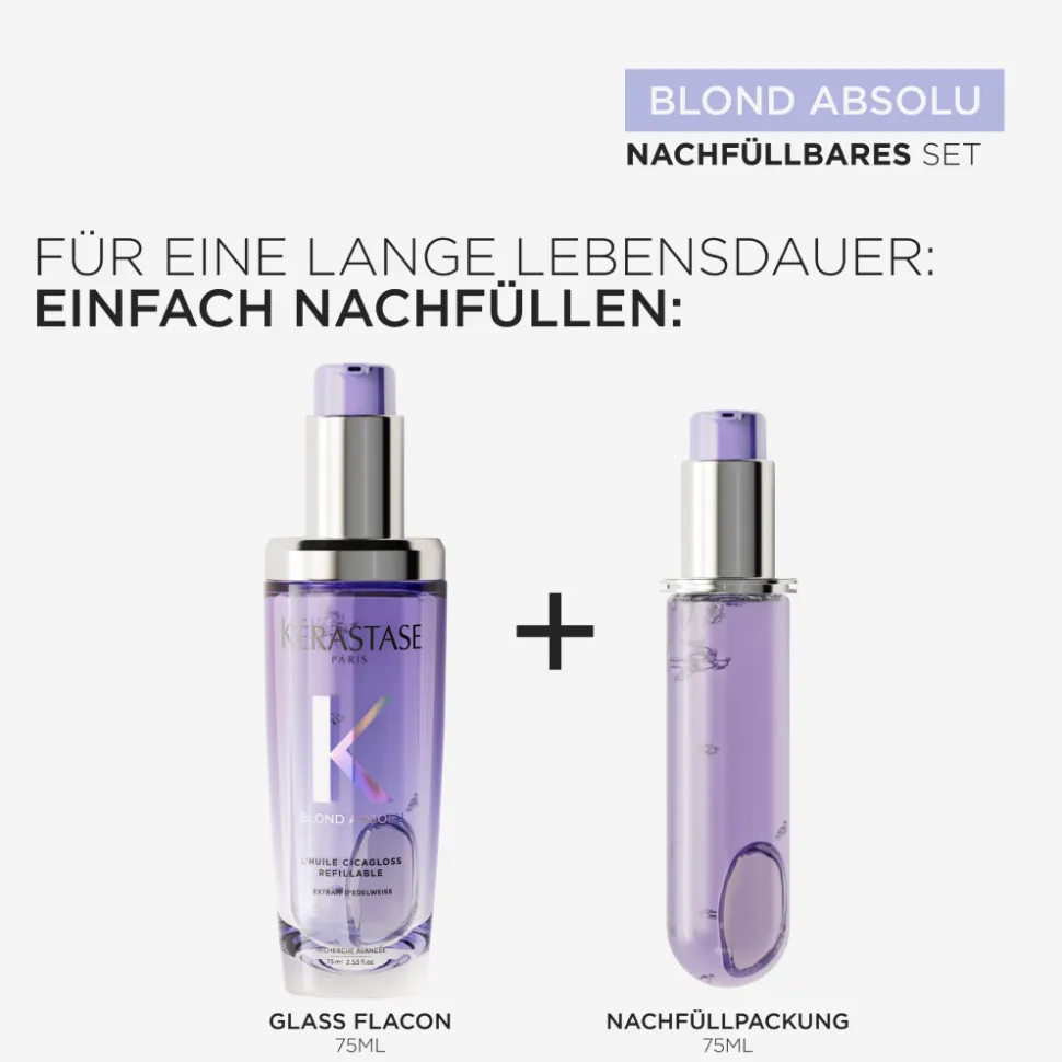 Das KÉRASTASE L´Huile Cicaextreme Full Pack bietet Ihnen eine umfassende Lösung für die Pflege von blondiertem Haar. Das Blond Absolu Huile Cicagloss ist ein innovatives Haaröl, das Ihr Haar tiefenwirksam pflegt und gegen strapazierende Hitze bis zu 230 °C schützt. Es wirkt sofort, um die aufgeraute Schuppenschicht zu versiegeln und Spliss zu reduzieren. Mit der Kraft des Edelweiss-Öls wird Ihr Haar augenblicklich geschmeidig, gestärkt und unglaublich weich. Diese intensive Pflege dringt bis in die Tiefen Ihrer Haarstruktur ein und sorgt langfristig für ein gesundes und vitales Aussehen. Nachhaltigkeit wird dabei großgeschrieben, denn die Nachfüllpackung besteht aus 95 % recyceltem Kunststoff.