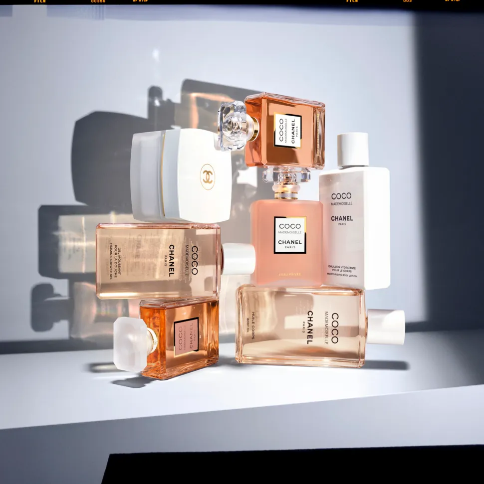 Ein Glasflakon mit geometrischer Silhouette bringt die stilvolle Eleganz der COCO MADEMOISELLE Linie zum Ausdruck.