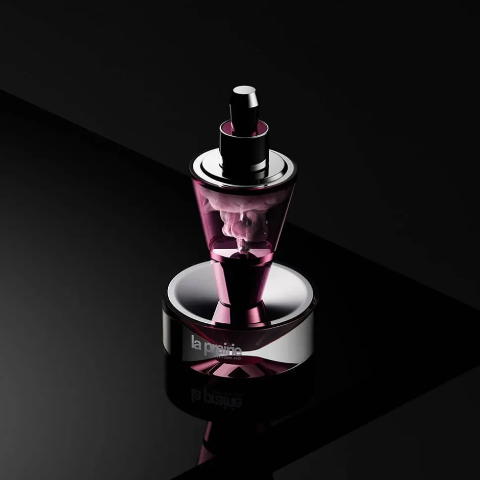 Der La Prairie-Flakon ist ein Meisterwerk der modernen Eleganz, das die Exklusivität des Inhalts widerspiegelt. In einem facettenreichen, violetten Design gehalten, steht er auf einem stabilen, transparenten Sockel, der dem gesamten Erscheinungsbild eine schwebende Leichtigkeit verleiht. Die silberne Kappe krönt das Design, während die raffinierte Form die luxuriöse Natur der Behandlung unterstreicht. Die klaren, präzisen Linien des Flakons harmonieren perfekt mit der hochwertigen Verarbeitung und lassen den ästhetischen Anspruch spürbar werden. Ein wahres Kunstwerk für Ihre Hautpflege-Routine, das jedes Badezimmer in einen exklusiven Spa-Bereich verwandelt.