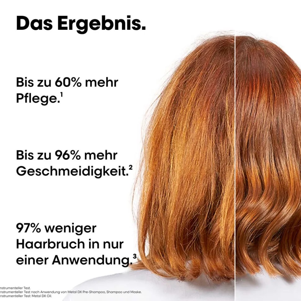 Anti-Haarbruch-Kit] Entdecke Metal DX, unsere exklusive Serie, angereichert mit Glicoamin zur Neutralisierung von Metallen in der Haarfaser. Das Metal DX Trio Pflegeset von L’Oréal Professionnel Paris besteht aus Shampoo, Maske und Öl. Metal DX wurde für alle Haartypen entwickelt. Metal DX beugt Haarbruch und Farbveränderungen vor. Das Shampoo reinigt sanft und entfernt Metallpartikel, die Maske pflegt und schützt ohne zu beschweren die Haarfaser vor erneuten Metallablagerungen. Als ideales Finish beugt das Öl Frizz vor und bietet Definition und Hitzeschutz. Für rundum gepflegtes Haar. Shampoo, 100ml + Maske, 75ml + Öl, 30ml