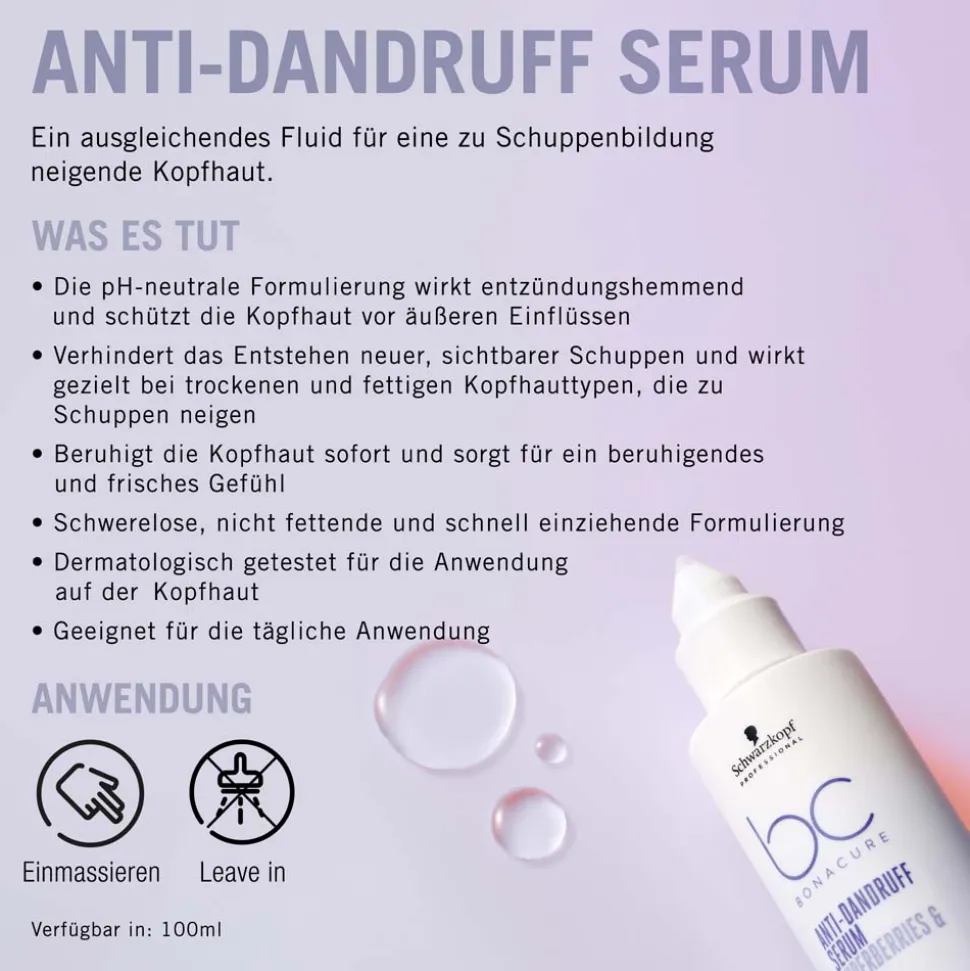 Das Schwarzkopf Professional Anti-Dandruff Serum bietet eine innovative Lösung für eine schuppenfreie und gesunde Kopfhaut. Die vegane Formulierung enthält einen einzigartigen Superfood-Komplex mit Superbeeren und AHA, die gemeinsam eine effektive Reinigung und Pflege der Kopfhaut ermöglichen. Dieses ausgleichende Serum besticht durch seine schwerelose und nicht fettende Textur, die es ideal für die tägliche Anwendung macht. Dank starker antimykotischer Eigenschaften werden sichtbare Schuppen zuverlässig entfernt und deren Neubildung verhindert. Gleichzeitig schützt das Produkt die Kopfhaut vor schädlichen Umwelteinflüssen und fördert die langfristige Gesundheit des Haares.