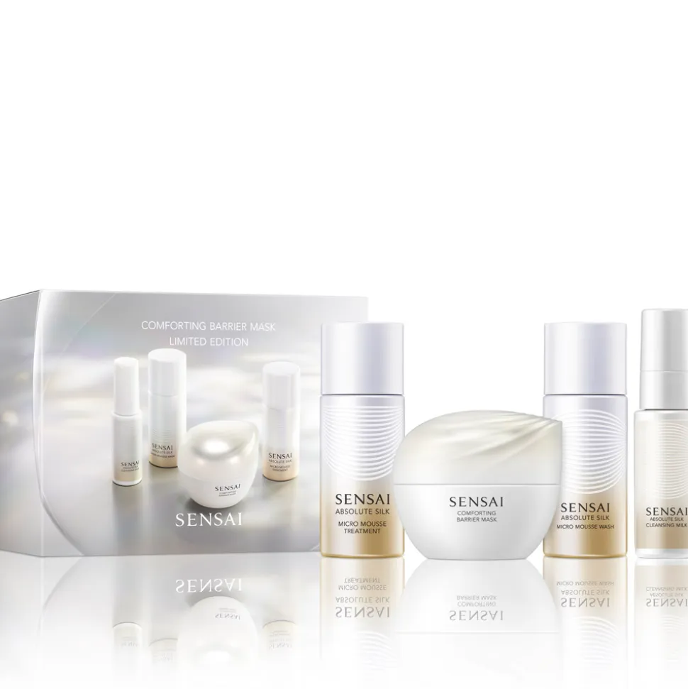 Die SENSAI COMFORTING BARRIER MASK LIMITED EDITION beeindruckt durch ihre pflegende Wirkung auf empfindliche Haut. Diese luxuriöse Leave-On-Maske versorgt Ihre Haut intensiv mit Feuchtigkeit und stärkt die natürliche Barrierefunktion. Sie schützt zuverlässig vor Trockenheit und Rötungen, während raue Hautpartien sanft geglättet werden. Das Set wird von der ABSOLUTE SILK Doppel-Reinigung und dem MICRO MOUSSE TREATMENT in Probiergrößen begleitet, die Ihre Hautroutine perfekt ergänzen. Die kombinierte Anwendung dieser hochwertigen Produkte sorgt für eine Haut, die sich geschmeidig, weich und seidig anfühlt.