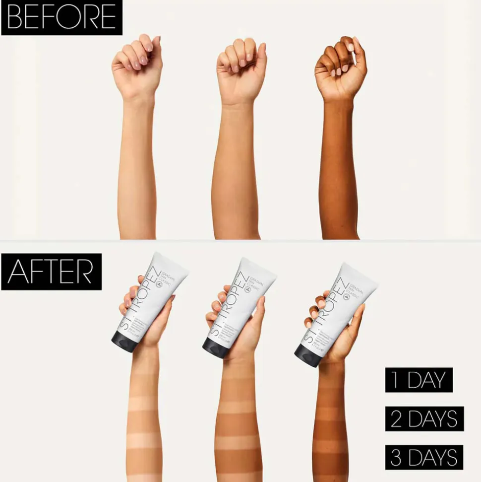 Die St. Tropez Daily Firming Lotion Light/Medium vereint innovative Hautpflege mit einem zarten Bräunungseffekt. Diese einzigartige Lotion bietet Ihnen fünf wesentliche Pflegevorteile: Sie spendet Feuchtigkeit, schützt, glättet, beruhigt, und strafft die Haut. Dank einer leicht auftragbaren Formulierung verleiht sie Ihrer Haut nach und nach eine natürliche, goldene Bräune, die bis zu 72 Stunden Feuchtigkeit schließt. Hochwertige Inhaltsstoffe wie Hyaluronsäure und pflanzliche Meeresalgen sorgen für eine intensive Feuchtigkeitsbindungsfähigkeit. Die antioxidative Mischung aus recycelten Heidelbeer- und Himbeersamenölen unterstützt zudem den Schutz Ihrer Haut vor Umwelteinflüssen. Die Lotion zieht schnell ein, hinterlässt keine klebrigen Rückstände und ist für alle Hauttypen geeignet, sogar für empfindliche Haut. Durch die Verwendung natürlicher Inhaltsstoffe und veganer Rezepturen steht die St. Tropez Lotion für höchste Qualität und Umweltbewusstsein.