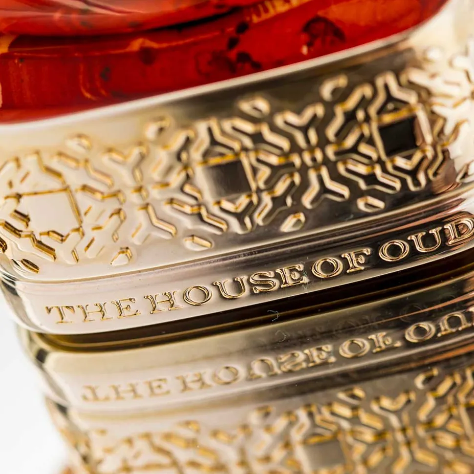 Der Flakon von The House of Oud Eau de Parfum Spray beeindruckt durch seine außergewöhnliche, ovale Form, die von handwerklicher Präzision zeugt. Die Oberfläche erinnert an ein kunstvolles Gemälde, in dem warme, goldene und rotbraune Töne ineinanderfließen und ein atemberaubendes Farbspiel erzeugen. Auf einem elegant verzierten Sockel präsentiert sich der Flakon wie ein kostbares Kunstwerk, das sowohl in seiner Form als auch in seiner Farbgebung einen einzigartigen Charakter besitzt. Jedes Detail, vom fließenden Design bis hin zur strukturierten Basis, spiegelt eine Verbindung von Tradition und Moderne wider und macht dieses Parfum zu einem visuellen Erlebnis.