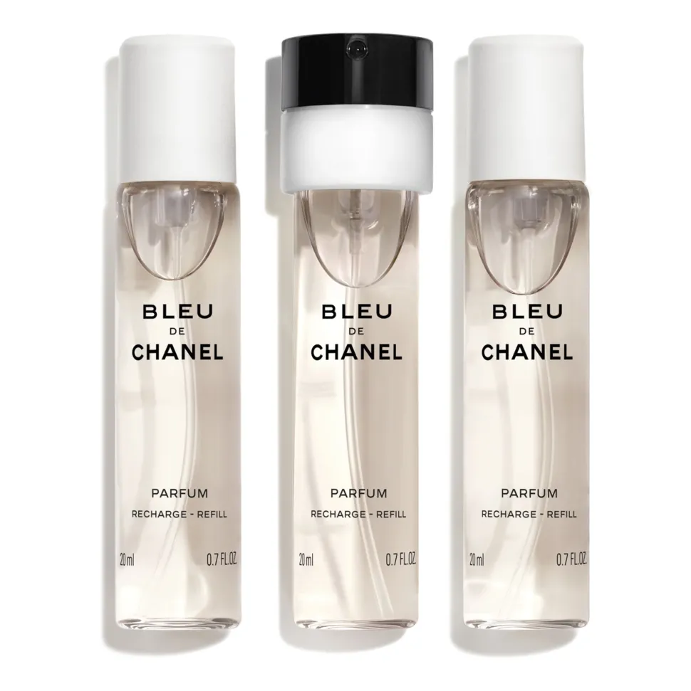 Die intensiv maskuline Signatur von BLEU DE CHANEL Parfum in einem praktischen nachfüllbaren „Twist and Spray“-Flakon (20 ml) für unterwegs.