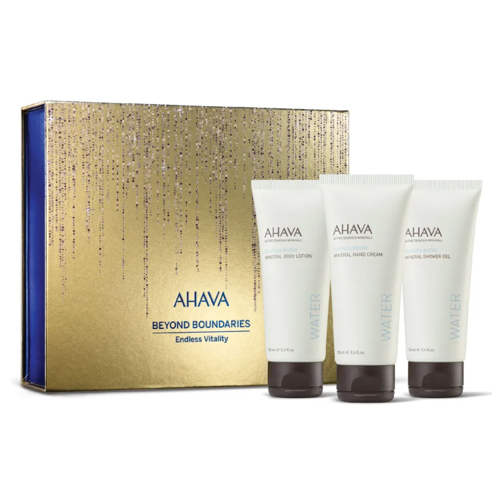 Das AHAVA Endless Vitality Holiday Kit bietet Ihnen eine wohltuende Auszeit vom Alltag. Ihre Haut wird durch die Mineral Handcreme mit wertvollen Mineralien aus dem Toten Meer verwöhnt und bleibt geschmeidig und sanft. Die Mineral Body Lotion spendet intensive Feuchtigkeit und sorgt für ein seidig glattes Hautgefühl. Das Mineral Shower Gel erfrischt und belebt die Sinne mit einem sanften, wohltuenden Duft, der an die Weiten des Meeres erinnert. Ergänzt wird das Set durch das Crystal Osmoter X6 Serum, das die Haut mit einem kraftvollen Feuchtigkeitskick versorgt und ihr neue Vitalität verleiht.