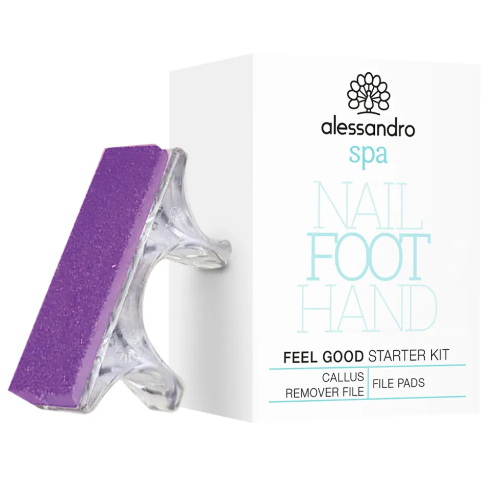 Das Alessandro Spa Feel Good Starter Kit besticht durch ein durchdachtes und ansprechendes Design. Die Hornhautfeile liegt dank ihrer ergonomischen Form angenehm in der Hand und ermöglicht eine präzise Anwendung. Die klare Linie der Feile wird durch die stylische Farbgebung der austauschbaren Blätter in Violett ergänzt, was dem Set einen modernen und zugleich professionellen Look verleiht. Jedes Detail ist sorgfältig gestaltet, um nicht nur funktional, sondern auch optisch ansprechend zu sein, wodurch das Set zu einem stilvollen Begleiter für Ihre Fußpflege wird.