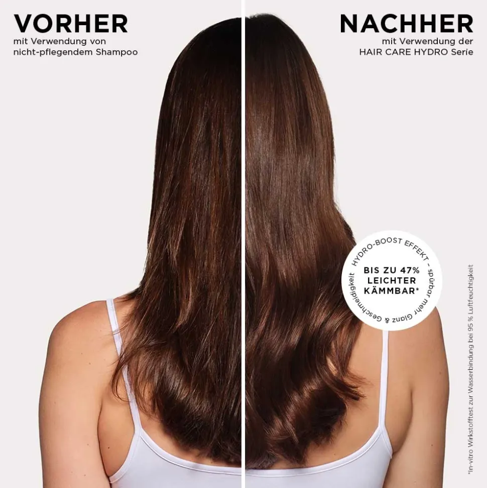 HYDRO CONDITIONER – Feuchtigkeit & Schutz für trockenes Haar Der HYDRO CONDITIONER mit mit dem innovativen Hydro-Boost-Complex aus feuchtigkeitsaktivierender Hyaluron-like Rotalge und Aloe Vera spendet intensive Feuchtigkeit und polstert das Haar auf*. Multimoist CLR™ sorgt für langanhaltende Hydration, während Marulaöl und Sheabutter das Haar geschmeidig machen, es leicht kämmbar halten und intensiven Schutz bieten, ohne zu beschweren. – Intensive Feuchtigkeit & aufgepolstertes Haar – Schutz ohne zu beschweren- Geschmeidiges und leicht kämmbares Haar Für Geschmeidigkeit und leichter kämmbares Haar – Ideal für stumpfes, trockenes Haar!