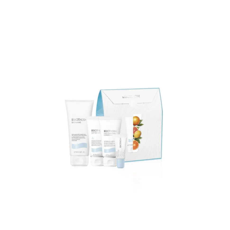 Das Biotherm L’Original Set ist ein wahrer Genuss für Ihre Haut. Es vereint die erfrischenden Eigenschaften von Zitrusessenzen mit intensiv feuchtigkeitsspendenden Wirkstoffen. Die Reinigende Dusch-Milch, angereichert mit ätherischen Zitrusölen, bietet eine sanfte Reinigung und hinterlässt die Haut geschmeidig und wohlriechend. Für unwiderstehlich weiche Lippen sorgt die Beurre de Lèvres Lippenpflege, die mit ihrer cremigen Textur und natürlichen Inhaltsstoffen überzeugt. Die Biomains Handcreme stärkt die natürliche Schutzbarriere Ihrer Hände, während die Bodymilk Lait Corporel L’Original Ihre Haut von Kopf bis Fuß mit Feuchtigkeit versorgt und pflegt. Die Kombination aus Vitamin E und Life Plankton Extrakt fördert die Hautelastizität und sorgt für ein seidig glattes Hautgefühl. Lassen Sie sich von dieser umfassenden Pflege verwöhnen.