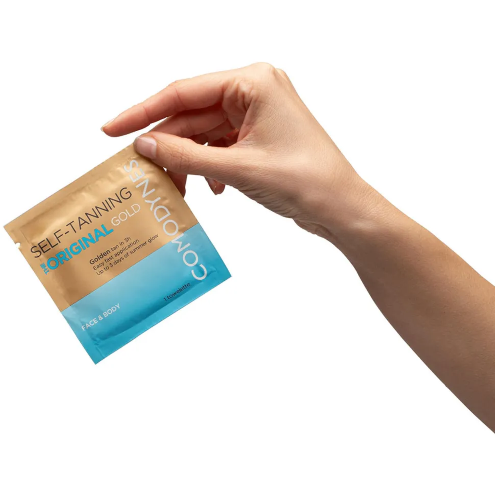 Erleben Sie eine Bräune, die so natürlich ist, dass sie von einer echten Sonnenbräune kaum zu unterscheiden ist, ohne die Risiken einer UV-Exposition einzugehen. Vertrauen Sie dem Comodynes Selbstbräuner SELF-TANNING THE ORIGINAL GOLD, um Ihre Haut effektvoll und sicher zu bräunen. Die formschöne Verpackung in warmen Gold- und Bronzetönen unterstreicht die luxuriösen Eigenschaften des Produkts. Die Tücher sind in einem kompakten, handlichen Format gehalten, das eine einfache Handhabung ermöglicht und gleichzeitig stilvoll wirkt. Perfekt für diejenigen, die Wert auf Qualität und Eleganz legen.