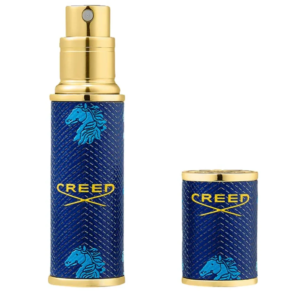 Der Creed Refillable Travel Spray präsentiert sich in einem edlen, blauen Design, das sowohl modern als auch zeitlos wirkt. Die samtige Oberfläche des Leders unterstreicht die Hochwertigkeit des Zerstäubers und wird durch goldene Akzente elegant ergänzt. Ein kunstvoll gestaltetes Pferdemotiv verleiht dem Flakon eine dynamische Note, während die kompakte Form ideal in Ihre Handtasche passt. Dieses Detail zeigt nicht nur Sinn für Ästhetik, sondern betont auch die Exklusivität und den Stil des Produkts. Ein Accessoire, das optisch und funktional höchsten Ansprüchen gerecht wird und Ihnen das Gefühl von unvergleichlichem Luxus bietet.