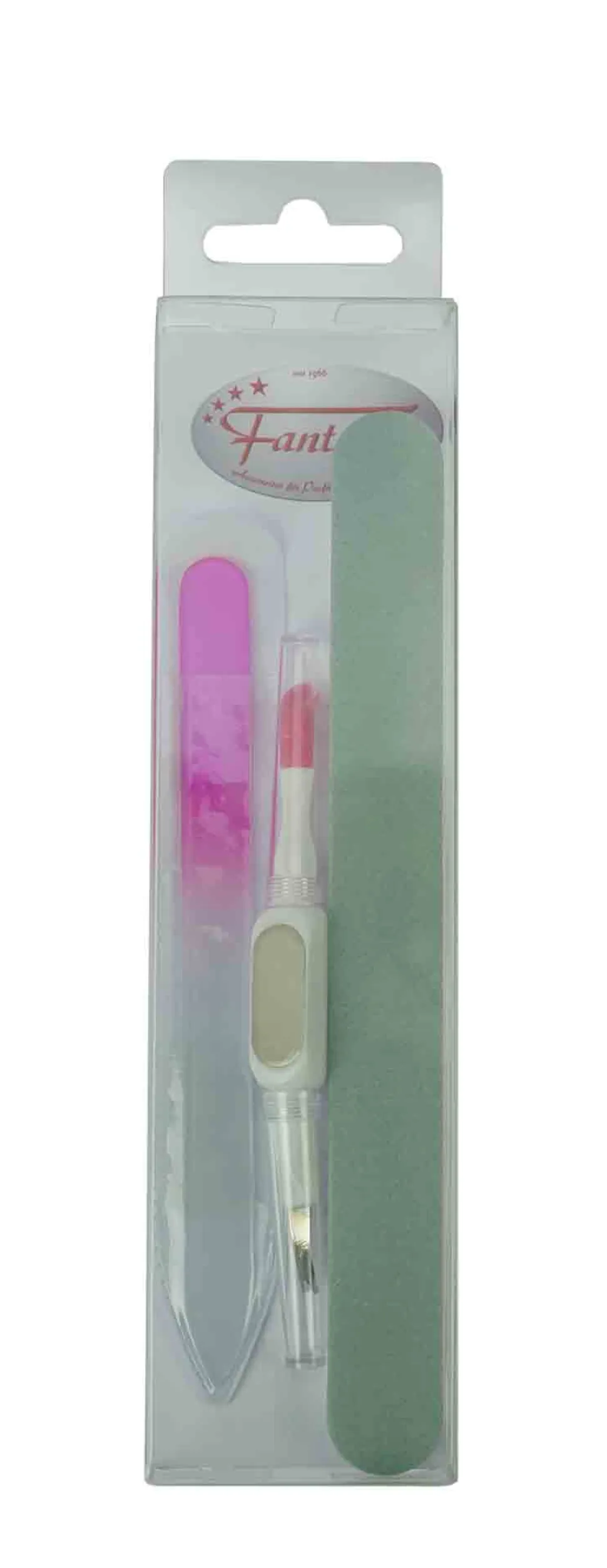 Das Fantasia Nail-Care Set bietet Ihnen alles, was Sie für eine gründliche und effektive Nagelpflege benötigen. Mit der hochwertigen Glasfeile kürzen Sie Ihre Nägel präzise und schonend. Das Set enthält zudem eine Polierfeile, die Ihren Nägeln einen natürlichen Glanz verleiht, als ob sie mit klarem Nagellack überzogen wären. Ergänzt wird das Set durch ein funktionales Hufstäbchen, das ideal zur Pflege der Nagelhaut und zum Säubern der Nagelränder geeignet ist. Dieses Set ist ein unverzichtbarer Begleiter für alle, die Wert auf gepflegte Hände legen und dabei auf Qualität setzen.