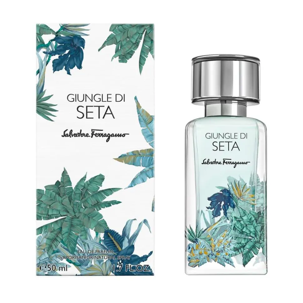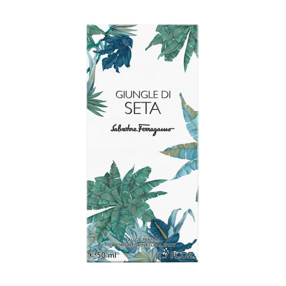 Der Flakon des Ferragamo Giungle di Seta Eau de Parfum Nat. Spray ist ein wahrhaftiges Kunstwerk. Die schlanke, elegante Form des Flakons wird durch eine harmonische, silbern glänzende Verschlusskappe stilvoll abgerundet. Das Design zeugt von einer präzisen Handwerkskunst, die den exotischen Charakter des Duftes visuell unterstreicht. Der Flakon ist transparent, mit einem kunstvollen, floralen Muster verziert, das die grünen und blauen Töne der Natur widerspiegelt. Jeder Aspekt des Designs lädt dazu ein, die harmonische Verbindung von Natur und Eleganz zu schätzen.