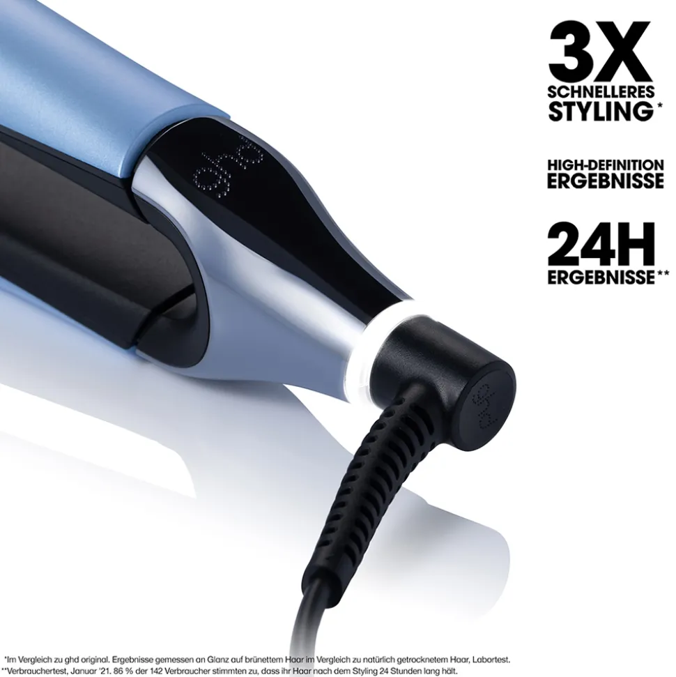 Der ghd chronos präsentiert sich in einem bezaubernden Icy Blue mit edlen Metallic-Akzenten, das sofort an eine glitzernde Winterlandschaft erinnert. Die elegante, abgerundete Form des Glätteisens liegt angenehm in der Hand und lädt zum kreativen Stylen ein. Ergänzt wird das Set durch ein hochwertiges, hitzebeständiges Etui im gleichen kühlen Farbton, das nicht nur stilvoll aussieht, sondern Ihr wertvolles Stylingtool sicher aufbewahrt. Die sorgfältige Verarbeitung und die luxuriöse Optik machen es zu einem echten Blickfang in Ihrem Styling-Repertoire.