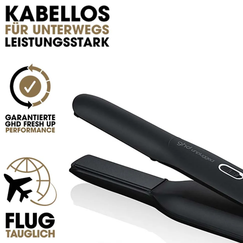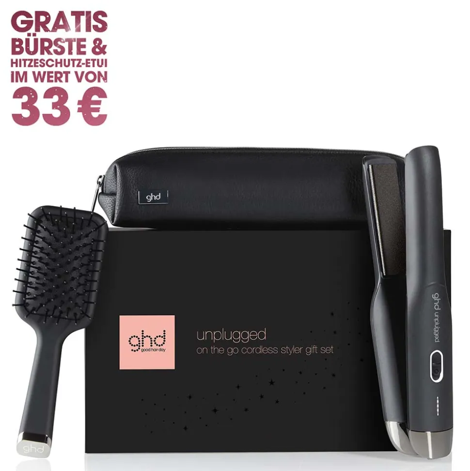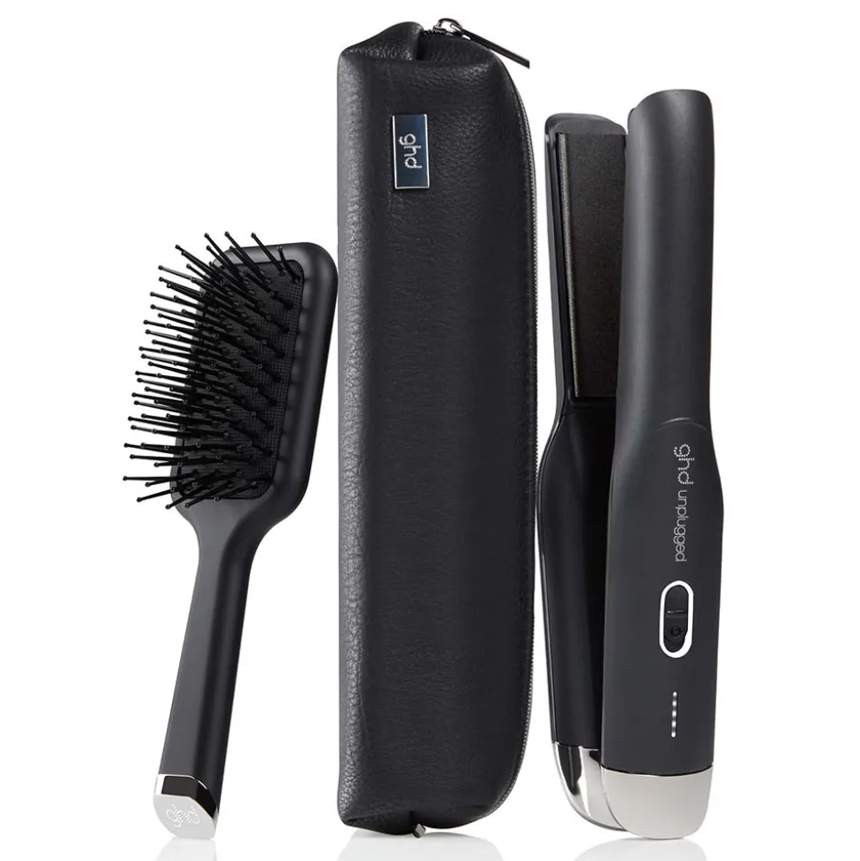 - GHD UNPLUGGED™ GESCHENKSET: enthält einen kabellosen Styler, Paddle Brush und hitzebeständiges Etui.
