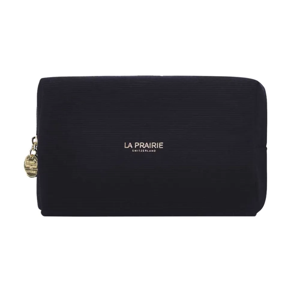 Edles Accessoire: Ein schwarzes Cordtäschchen mit goldenem La Prairie-Logo und Signature-Zipper – zeitlose Eleganz für unterwegs.