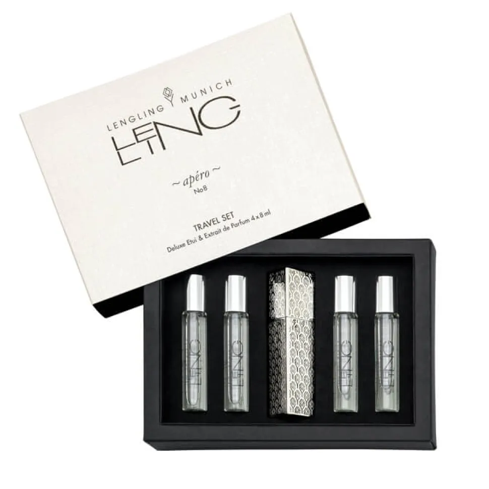 Das LENGLING MUNICH No 8 Apéro Travel Set präsentiert sich in einem formschönen Design, das Eleganz und Praktikabilität vereint. Die vier Mini-Sprays sind in einem ansprechend gestalteten Deluxe-Etui untergebracht, das durch seine schlichte, aber edle Optik besticht. Jedes Spray ist in ein schlankes, transparentes Fläschchen gehüllt, wodurch der kostbare Inhalt stilvoll zur Geltung kommt. Das Etui selbst passt perfekt in jede Mantel- oder Handtasche und ist damit der ideale Begleiter für unterwegs. Die Kombination aus dezenter Ästhetik und praktischem Design macht dieses Set zu einem unverzichtbaren Accessoire für alle Liebhaber exklusiver Düfte.