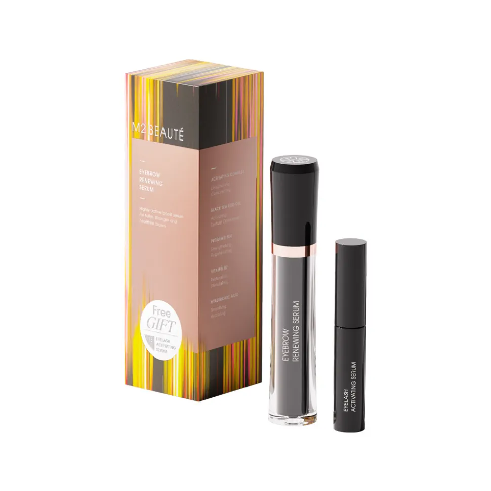 Der Flakon des M2Beauté Eyebrow Renewing Serums beeindruckt durch seine schlanke, elegante Form, die durch klare Linien und eine stilvolle Farbgebung besticht. Mattes Schwarz kombiniert mit transparenten Elementen verleiht dem Serum eine zeitlose Ästhetik. Die beiliegende Sondergröße des EYELASH ACTIVATING SERUMs passt nahtlos ins Designkonzept und bietet eine kompakte, stilvolle Ergänzung. Das Set spricht durch seine harmonische Gestaltung und die subtile Eleganz sowohl das Auge als auch den Sinn für Exklusivität an.