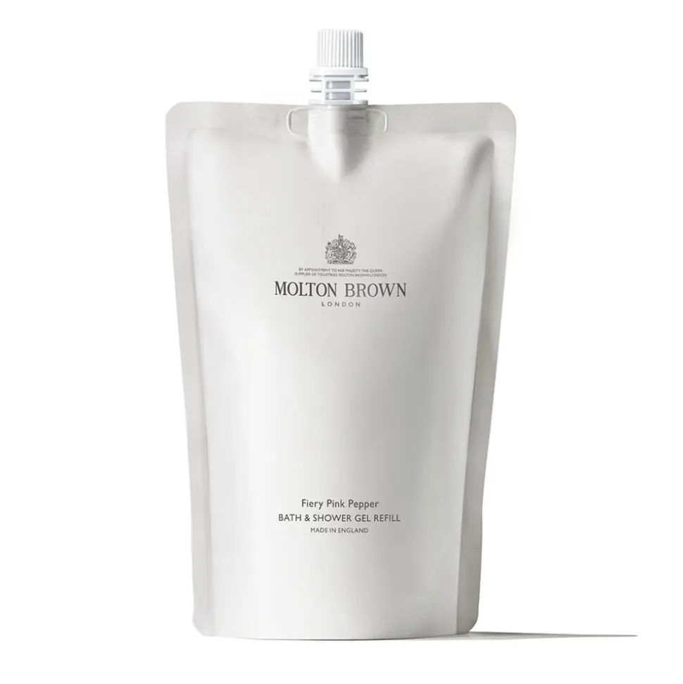Das Molton Brown Fiery Pink Pepper Bath & Shower Gel Refill präsentiert sich in einem schlichten, aber eleganten Nachfüllbeutel. Die minimalistische Gestaltung unterstreicht die Raffinesse des Produkts. Die weiche, flexible Form des Beutels ermöglicht eine komfortable Handhabung und ein einfaches Auffüllen Ihrer Glasflasche. Der dezente Weißton des Beutels spiegelt die Reinheit und Eleganz wider, während die feinen, grauen Schriftzüge einen Hauch von Klasse hinzufügen. Diese durchdachte Designwahl macht das Produkt zu einem stilvollen Begleiter in Ihrem Badezimmer.