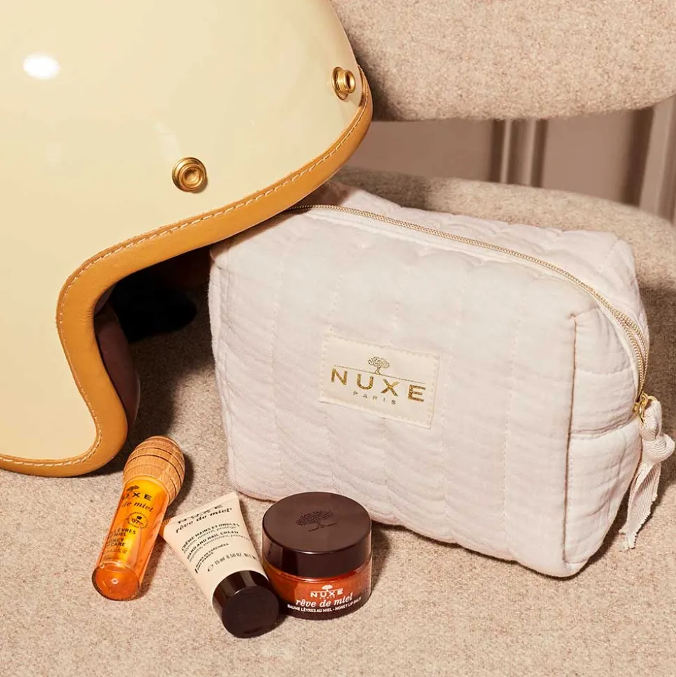 Das NUXE Essentials Reisegrößen Set präsentiert sich in einer eleganten, cremefarbenen Tasche, die stilvoll und praktisch zugleich ist. Der Lippenbalsam und die Lippenpflege sind in handlichen Tuben verpackt, die durch ihre kompakte Größe ideal für die Handtasche sind. Die Hand- und Nagelcreme kommt in einer ebenso praktischen Tube, die durch ihr dezentes Design besticht. Die harmonische Farbgestaltung und das durchdachte Packaging machen dieses Set zu einem ästhetischen Erlebnis, das Funktionalität und Eleganz vereint.