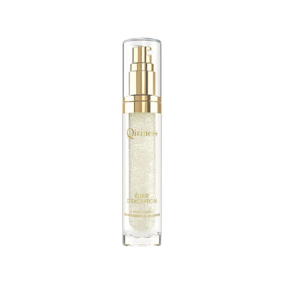 Der Flakon des QIRINESS Elixier d´Exception ist ein elegantes Beispiel für luxuriöses Design. Der zylindrische, transparente Glasbehälter mit einem goldenen Pumpverschluss strahlt pure Raffinesse aus. Durch den glasklaren Korpus schimmert das edle Serum in einem sanften Goldton und signalisiert bereits optisch die Exklusivität des Inhalts. Die subtile Eleganz des goldenen Verschlusses, gepaart mit der klaren Linienführung des Designs, unterstreicht die Wertigkeit und macht dieses Produkt zu einem Highlight in jedem Badezimmer. Die Kombination aus Funktionalität und stilvoller Ästhetik sorgt dafür, dass bereits das Auftragen des Serums zu einem besonderen Moment der Pflege wird.
