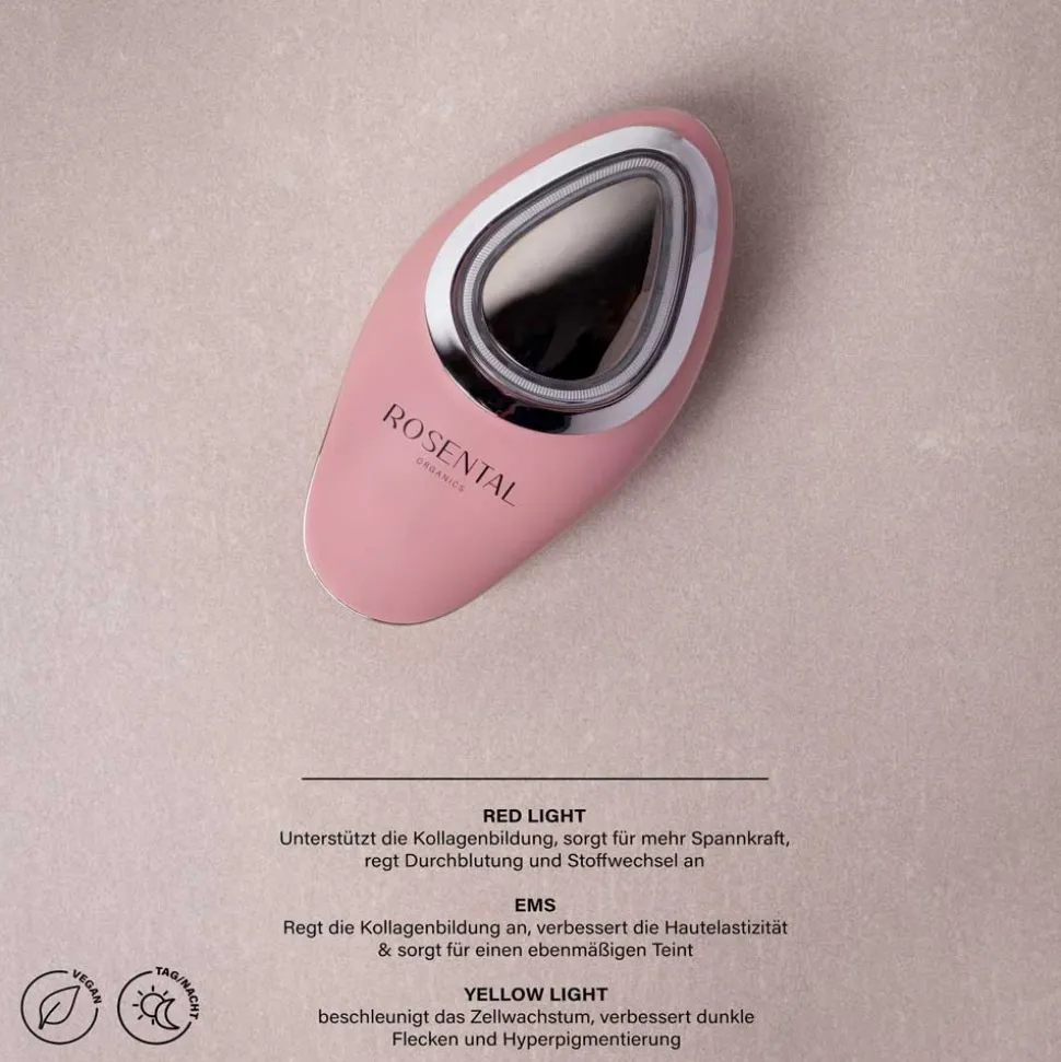 Die Rosental EMS Cleansing Brush besticht durch ein elegantes, modernes Design in einem ansprechenden Rosé-Ton. Die ergonomische Form liegt angenehm in der Hand und ermöglicht eine mühelose Anwendung. Die Vorderseite ist mit einer fein strukturierten Silikonoberfläche ausgestattet, die sowohl grobe als auch feine Borsten kombiniert, um unterschiedliche Hautbedürfnisse zu erfüllen. Die Rückseite zeigt einen glänzenden Metallbereich, der die hochwertige Verarbeitung unterstreicht. Diese perfekte Symbiose aus Funktionalität und Ästhetik macht die Rosental EMS Cleansing Brush zu einem stilvollen Begleiter in Ihrer täglichen Pflegeroutine.