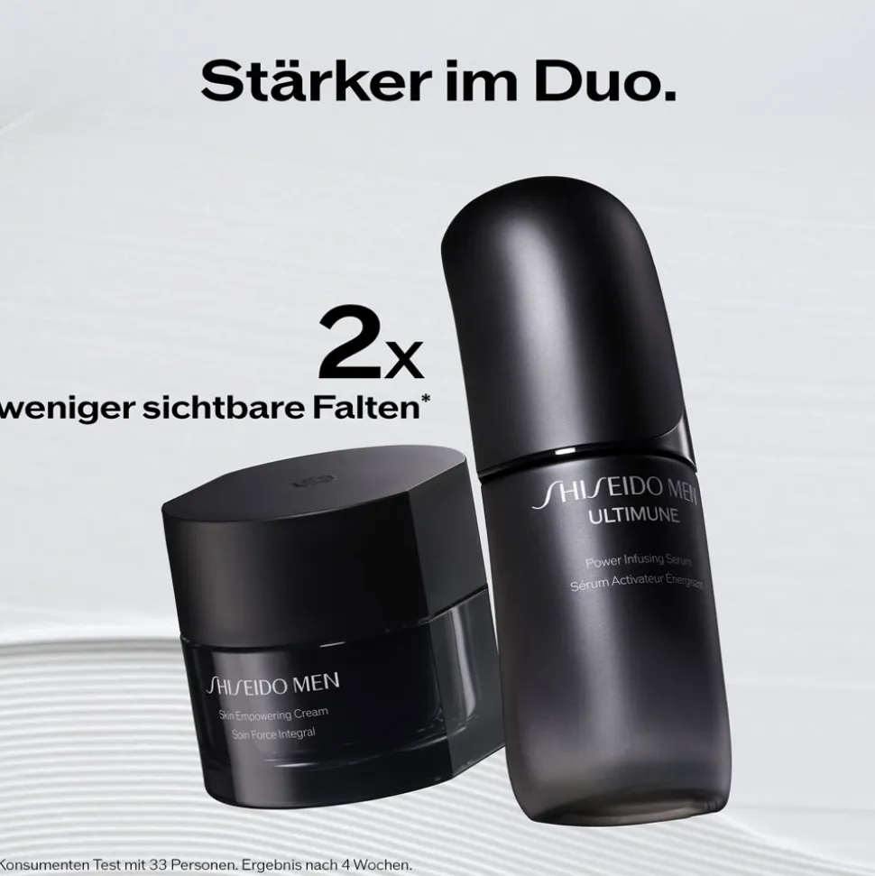 Basierend auf über 100 Jahren Shiseido-Forschung über die männliche Haut.VERWANDELN SIE AGING IN POWER.92% fanden, dass die Haut nach 3 Tagen straffer aussieht.*Unterstützt durch Peptid AA+Dieses Serum mit Mehrfachwirkung reduziert verschiedene Probleme der Männerhaut (mangelnde Festigkeit, Falten, Mattigkeit, sichtbare Poren) in einem einzigen Schritt.Wichtigste Inhaltsstoffe:Das neue Peptid AA+ trägt dazu bei, die innere Struktur der Haut zu stärken, während die Triple Camellia Technology, unterstützt durch neue Inhaltsstoffe, die 3 Schwachstellen der männlichen Haut (geringe innere Abwehrkräfte, geringe Antioxidationskraft, geringe Widerstandsfähigkeit gegen UV-Schäden) angeht. Ein zusätzlicher Oil-Control-Komplex verfeinert die Poren und reduziert überschüssigen Talg. Arginin HCL: trägt zur Verbesserung der Feuchtigkeitsversorgung der Haut bei.Testergebnisse:- 94% spürten eine sichtbare Verringerung der verschiedenen Zeichen der Hautalterung in nur 3 Tagen.*Es ist klinisch erwiesen, dass es bei alleiniger Anwendung mehrere Anzeichen der Hautalterung verbessert:+ 35% Festigkeit**-48% Mattigkeit**-21% Falten***Es ist klinisch erwiesen, dass die Ergebnisse in Kombination mit der Skin Empowering Cream noch besser ausfallen:+44% Festigkeit**- 64% Müdigkeit**-30% Falten***- Poren werden bei 93% der Anwender in nur 3 Tagen sichtbar verkleinert.** Verbrauchertest mit 108 Personen.**Klinischer Test mit 33 Personen. Expertenbewertung nach 8 Wochen.***Instrumenteller Test mit 33 Personen. Ergebnis nach 8 Wochen.