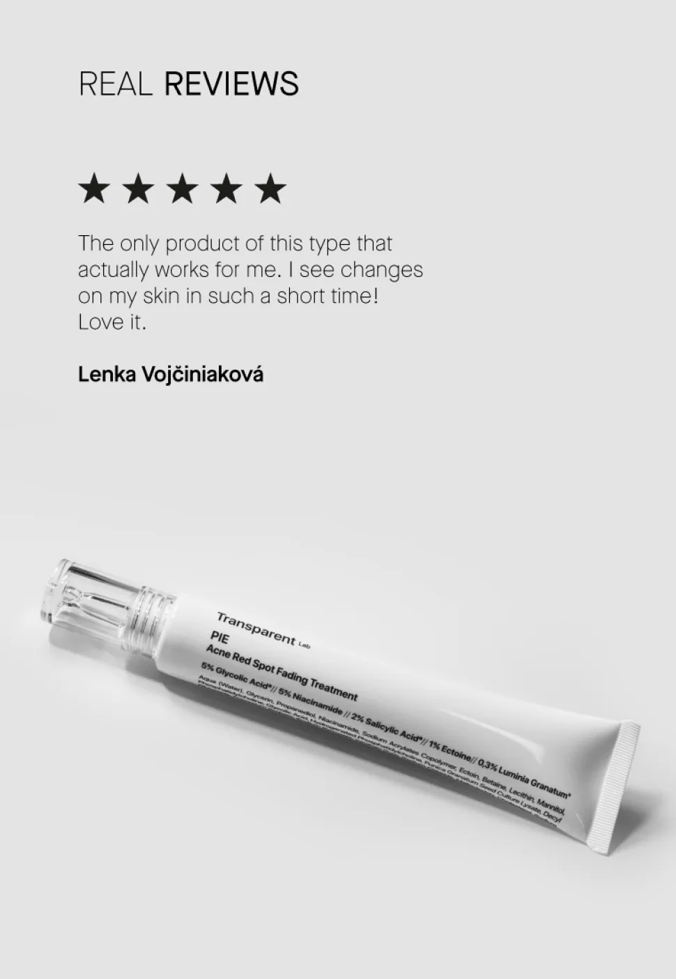 Das Transparent Lab PIE Acne Red Spot Fading Treatment zeigt sich in einem schlichten, eleganten Design, das den Fokus auf Funktionalität legt. Die schlanke, zylindrische Tube ist in einem minimalistischen Weiß gehalten, welches durch zurückhaltende schwarze Schrift ergänzt wird. Diese Kombination strahlt eine zeitlose Ästhetik aus, die in jedem Badezimmer überzeugt. Die feine Spitze der Tube ermöglicht eine einfache und präzise Dosierung, sodass Sie das Produkt gezielt auf die gewünschten Hautpartien auftragen können. Das Design reflektiert die Philosophie des Produkts: Effizienz gepaart mit Klarheit.
