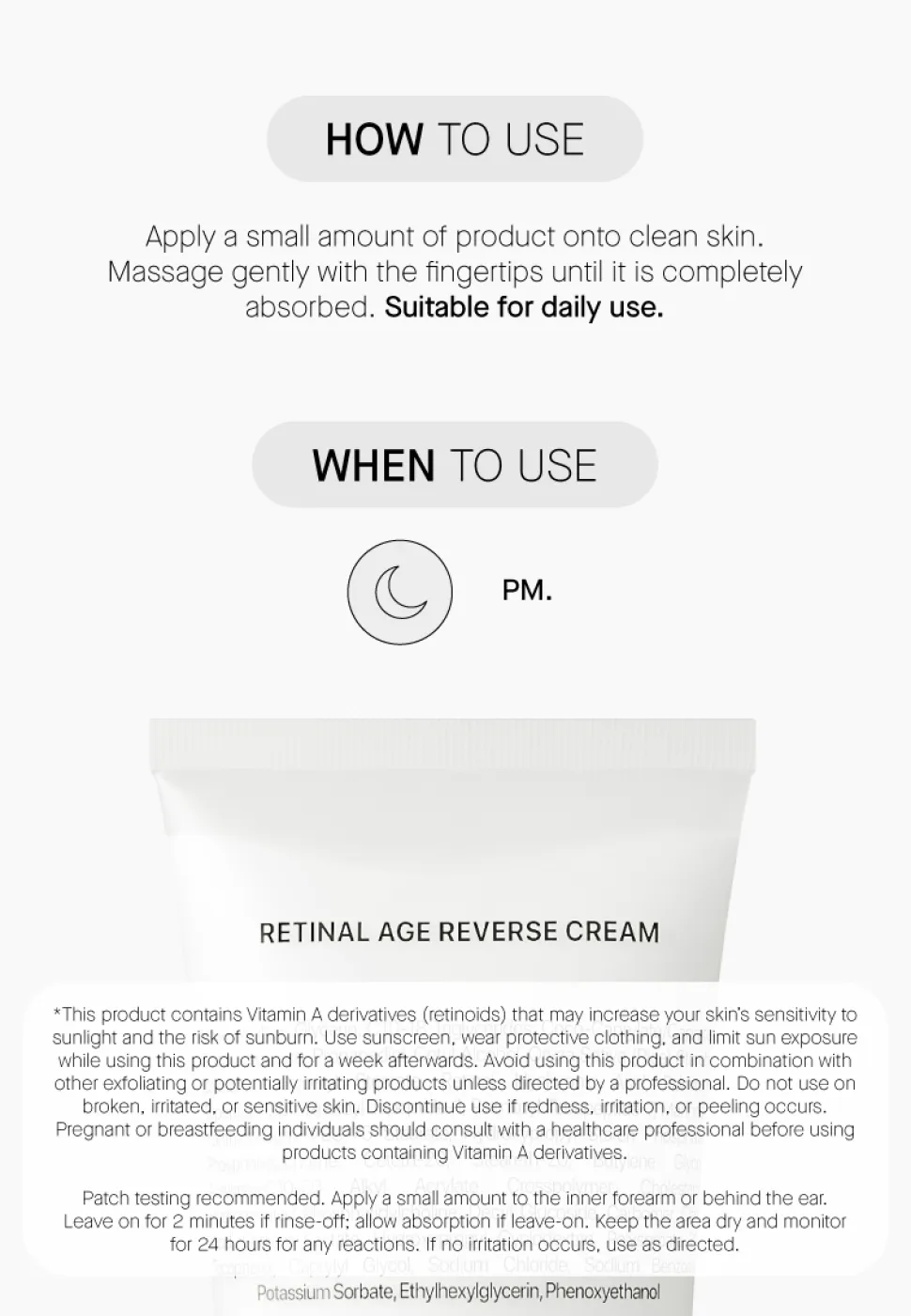 Nur für den Gebrauch auf der Haut geeignet. Direkter Kontakt mit den Augen ist zu vermeiden. Bei Berührung mit den Augen sofort mit Wasser ausspülen. Nicht auf gereizter oder geschädigter Haut anwenden. Außerhalb der Reichweite von Kindern aufbewahren.